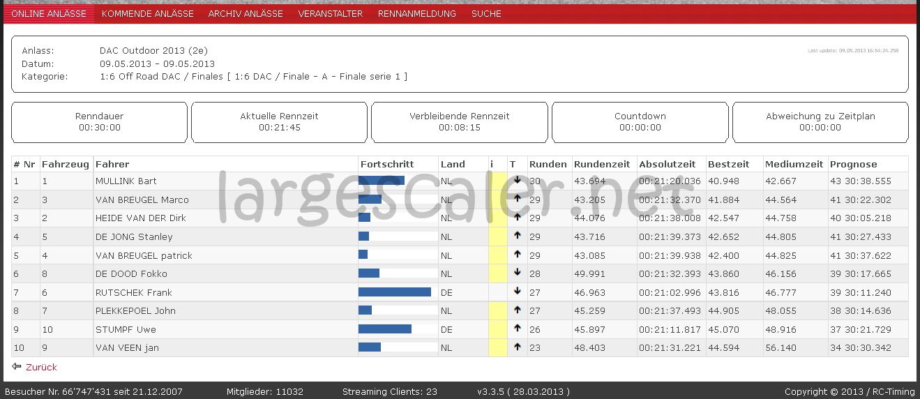 Ab in’s Viertel B und alle Augen auf Frank, Mathias und Uwe. Das wird schon ein hartes Stück und leider ist es sehr unwahrscheinlich, dass ausgerechnet unser D-Team am Ende des Laufes die ersten drei Plätze belegen wird … aber schauen wir einmal ganz genau zu, wie sich unsere Recken schlagen werden. Frank zieht gleich hoch von fürnf auf eins und Uwe ab auf die Drei. Mathias von acht auf fünf hoch und es sieht alles nach einer kleinen Sensation aus. Ist das wieder aufregend … nicht mal Halbzeoit und Uwe auf der Zwei hinter Frank. Jetzt muss Mathias noch mal ran … die Zeiten passen gut und wenn da nicht der flotte Mike Smit wäre. Vorne die Abstände mit 5 Sekunden nicht sehr groß und da lässt sich in drei Minuten noch viel machen. Uwe’s Polster etwas kleiner jetzt, aber er gibt Gas. Nun ist er 3s dicht an Frank und nach hinten der Abstand mit 17s jetzt größer zu Alex. Der muss aber aufpassen, dass Eric nicht noch 2s aufholt. Für Mathias auf der Fünf doch zu viele Meter aufzuholen. Uwe patzt wieder rum und verliert 8s. Mathias jetzt auf vier und nahe der Sensation. Wir sind im Viertel und es sind 15 Minuten zu fahren. Er zieht durch und mir kribbelt es schon auf dem Rücken … ein Unglück jagd das nächste … der Vordermann plötzlich schneller und er langsamer … ich tippe aber darauf, dass er das noch schafft. Vier Sekunden gilt es zu holen … das ist bestenfalls mal eine ordentliche und saubere Runde. Ach Mensch … immer wenn man’s braucht, klemmt’s … enge Sache … jetzt klemmt auch noch der Zeitserver … das halte ich nicht durch. Endergebnis bleibt geheim.